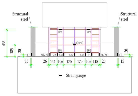 To record strains and displacements during the test, each specimen was arranged with plenty of internal strain gauges and external measuring instruments. As illustrated in Figure 3, a linear variable differential transducer (LVDT) was used to monitor the top displacement of the wall and the other LVDTs were employed to record the flexural deformation, shear deformation, and axial deformation of the wall panel at a height of 425 mm measuring from the foundation. As shown in Figure 5, internal strain gauges were adopted to measure the strains of reinforcement bars and steel sections. The strain gauges located in the brackets were arranged at the back side of the wall. For clarity, the structural steel is offset to the outside of the specimen in Figure 5.