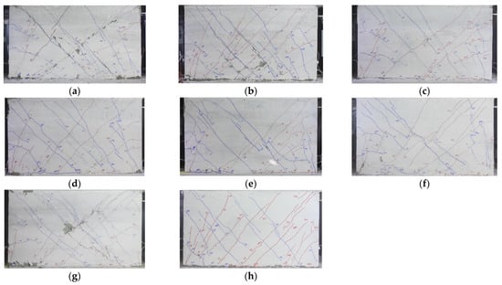 Crack distribution at the state of peak lateral strength: (a) W-4-0.18; (b) W-8-0.18; (c) W-4-0.26; (d) W-8-0.26; (e) W-4-0.35; (f) W-6-0.35A; (g) W-6-0.35; and (h) W-6-0.35B.
