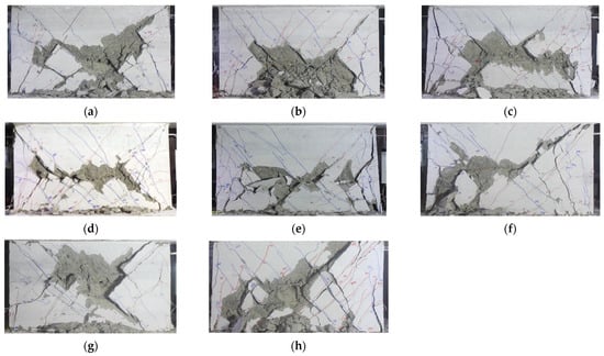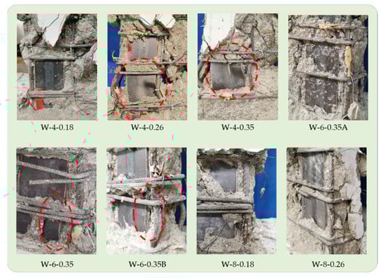 Failure stage of the specimens: (a) W-4-0.18; (b) W-8-0.18; (c) W-4-0.26; (d) W-8-0.26; (e) W-4-0.35; (f) W-6-0.35A; (g) W-6-0.35; and (h) W-6-0.35B.