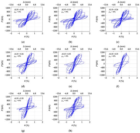 A comparison of the average peak strength of positive and negative loading directions for the specimens is shown in Figure 11. Under the same ALR, a higher steel ratio resulted in higher lateral strength. Improvements of 15.99% and 16.10% were observed when increased from 4% to 8% for specimens with ALRs of 0.18 and 0.26, respectively. For specimens with an ALR of 0.35, the lateral strength increased 16.37% when increased from 4% to 6%.