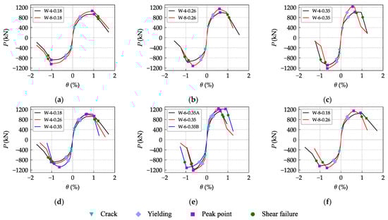 Hysteretic responses of the test specimens: (a) W-4-0.18; (b) W-8-0.18; (c) W-4-0.26; (d) W-8-0.26; (e) W-4-0.35; (f) W-6-0.35A; (g) W-6-0.35; and (h) W-6-0.35B.