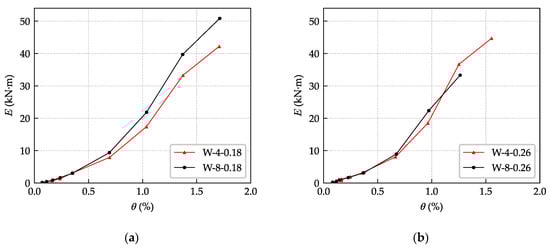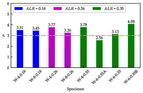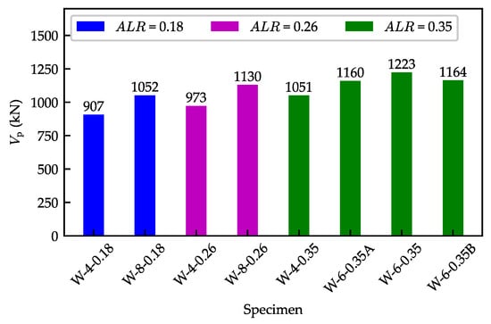 Additionally, a higher ALR resulted in higher lateral shear strength. The lateral strength increased 15.88% when ALR increased from 0.18 to 0.35 for specimens with a of 4%. A rise of 7.41% was observed when ALR increased from 0.18 to 0.26 for specimens with a of 8%. However, no noticeable effect of horizontal reinforcement ratio on shear strength was recorded, as specimens W-6-0.35A and W-6-0.35B had almost the same shear strength while the horizontal reinforcement ratio of specimen W-6-0.35B became double. This phenomenon is consistent with the conclusion drawn by Paulay [].