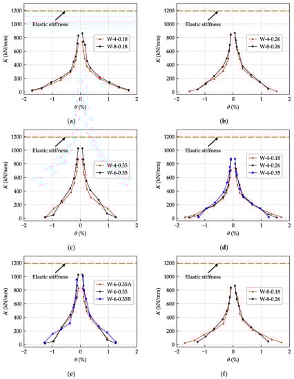 Relation curves of average secant stiffness versus drift ratio of specimens: (a) ALR = 0.18; (b) ALR = 0.26; (c) ALR = 0.35; (d) = 4%; (e) = 6%; and (f) = 8%.