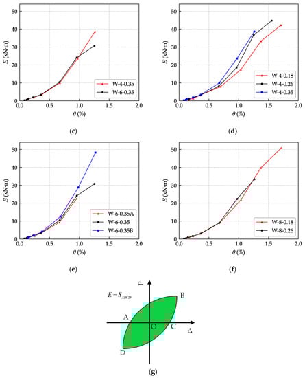 Cumulative energy dissipation: (a) ALR = 0.18; (b) ALR = 0.26; (c) ALR = 0.35; (d) = 4%; (e) = 6%; (f) = 8%; and (g) the diagram of the loop energy E.
