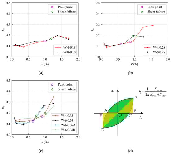 Figure 15 depicts the variation curves between the equivalent viscous damping coefficients and the drift ratio . Generally, increased gradually with the increase in the loading drift level. It is shown that a larger ALR resulted in a larger initial , which is calculated from the first loading loop. The initial was 0.11, 0.13, and 0.15, on average, for specimens with ALRs of 0.18, 0.26, and 0.35, respectively. The curves became steeper after peak shear capacity was attained. What is interesting is that significantly decreased after the shear failure for specimens W-4-0.18, W-8-0.18, and W-8-0.26, while this phenomenon did not occur in specimens with a higher ALR, i.e., 0.35. A greater horizontal distributed reinforcement ratio also enhanced , as seen from Figure 15c.