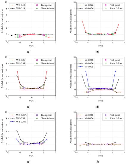 The axial deformation was taken from the average value of LVDTs 3 and 4 when the specimens were unloading and reverse loading to the zero displacements for each imposed drift level. It should be noted that the shear and flexural deformation components included in the total deformation measured by LVDTs 3 and 4 were very small at zero displacements and were reasonably ignored. Figure 16 shows the variation curves of the axial deformation of the specimens versus the imposed drift levels. In Figure 16, positive deformation data represent axial shortening, and negative values represent axial elongation. Specimens W-4-0.18 and W-8-0.18, with a relatively small ALR, had a phenomenon of axial elongation during the loading procedures, as seen from Figure 16a. This is because the tensile plastic strain of the reinforcement and steel cannot be fully recovered, and the tensile cracks cannot be completely closed during unloading and reversed loading.
