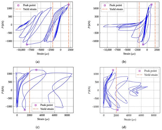 Strain history curves of specimen W-6-0.35: (a) Z5; (b) F2; (c) SP3; and (d) SP6.
