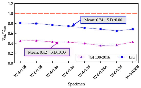 The formula proposed by Liu et al. [] is the second one evaluated in this study. Previous studies [,] have pointed out that, for squat shear walls, the contribution of vertical distributed reinforcement to the shear strength is significant and should not be ignored. Taking vertical distributed reinforcement into account, Liu et al. [] proposed a shear strength formula for squat SRC shear walls, based on a regression analysis of test data, as shown in Equation (8).