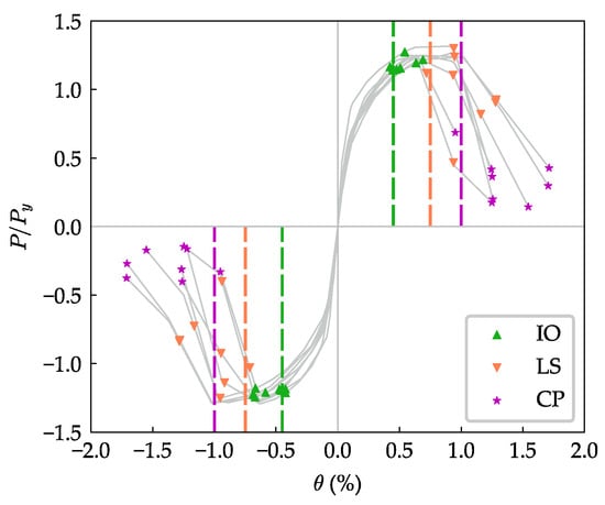 In performance-based seismic design and the assessment of structures, a component should satisfy the acceptance criteria for a given performance level. Six discrete structural performance levels are defined in ASCE 41-17 [], i.e., immediate occupancy (IO, S-1), damage control (DC, S-2), life safety (LS, S-3), limited safety (LiS, S-4), collapse prevention (CP, S-5), and not considered (NC, S-6). Among the six performance levels, IO, LS, and CP are three key ones. According to Tables 10–20 in ASCE 41-17 [], the acceptance criteria of performance levels IO, LS, and CP for structural walls controlled by shear are 0.40%, 0.75%, and 1.0%, respectively.