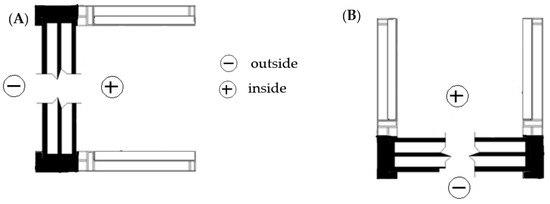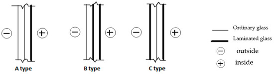 The specimens of three types of IGU according to the arrangement of the glasses were tested: (A) two ordinary sheets of glass (external and inner) and laminated glass (internal); (B) ordinary glass (external) and two laminated glasses (inner and internal); (C) and ordinary glass (inner) and two laminated glasses (external and internal) (Table 1 and Figure 2).