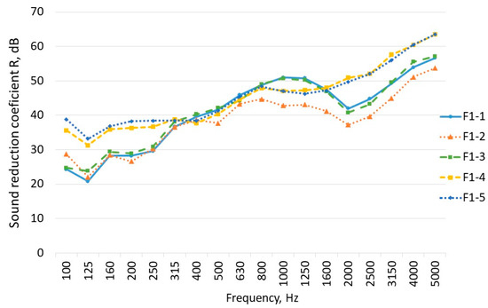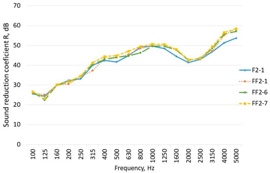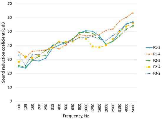 The frequency dependences of the sound reduction index (R) of the 1st group of A-type specimens are presented in Figure 6.
