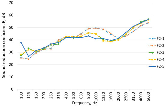 At frequencies above 3150 Hz, sound insulation of all specimens is ≥50 dB, except specimens F1-4 and F1-5, for them sound insulation is ≥50 dB starting from 2000 Hz. The specimens F1-4 and F1-5 have sound insulation ≥ 60 dB in 4000–5000 Hz frequency range. From the graphs in Figure 6 it can be seen that when ordinary glass and gas cavity of the same thickness are used, and only changing thickness of laminated glass sheet, the sound insulation of specimens F1-1, F1-2, and F1-3IGU is very similar. However, when glass sheets and gas cavities of different thicknesses are used (specimens F1-4 and F1-5), sound insulation increases up to 10 dB in frequency ranges 100–315 Hz and 2000–5000 Hz. The place of resonance of these specimens moves to lower frequencies: from 2000 Hz to 1250 Hz due to stiffness change (higher bending stiffness).