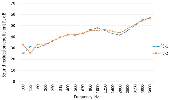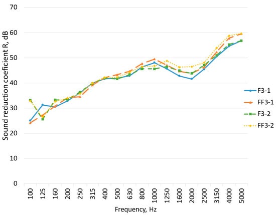 Comparison of the sound reduction indexes of specimens F1-3 and F1-4 showed that the influence of the gas cavity thickness (increased from 18 mm to 20 mm) is quite significant, especially in the low frequency (100–350 Hz) and higher frequency (550–5000 Hz) ranges. Unfortunately, there is a slight reverse effect in the frequency range between 900 and 1500 Hz.