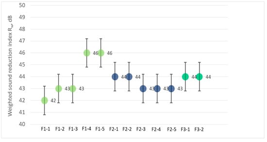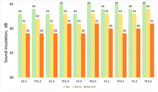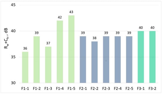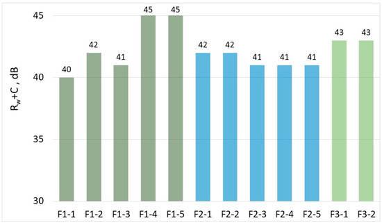 It can be seen from Figure 13 that the weighted sound reduction index (Rw) value varies from 42 dB to 46 dB (difference 4 dB) for A-type specimens; from 43 dB to 44 dB (1 dB difference) for B-type specimens; and the Rw value is 44 dB for C-type specimens. Thus, it can be stated that using for façade glazing triple IGU with one internal laminated glass and two ordinary glass sheets, a larger variation in sound insulation is notable compared with IGU of two laminated and one ordinary glass sheets. Moreover, it should be noted that when using two laminated glass sheets and one ordinary glass sheet, it does not imply better sound insulation compared with one laminated glass sheet and two ordinary glass sheets. This comparison shows that the highest weighted sound reduction index (Rw) value is obtained by increasing the mass of the external glass sheet (using thicker ordinary or laminated glass), and increasing the thickness of the gas cavity. Comparing the Rw values of F2-1 and F2-2 with the values of F3-1 and F3-2 also shows that the influence of the inner and external glass sheets on the weighted sound reduction index (Rw) value of the entire structural glazing is close to similar.