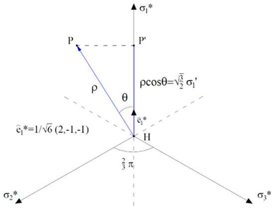 The component has is proper orientation in the deviatoric plan (Figure 2) where axes are the projection of the system on the deviatoric plane. The purpose is to express the principal tensions with reference to coordinates which consent to describe the failure surface as a function of sections, rotating around the hydrostatic axis. First of all, it is needed to determine the projection of the vector on the axis whose unitary vector has components . This could be demonstrated by stating that lies on the same plane defined by the hydrostatic axis . Given the orthogonality of with respect to the hydrostatic axis, the first director cosine will be the complement of in the resulting right triangle. Considering the symmetry of with respect to the other two axes , we can obtain the other two components of equal value of the unit vector which will be .