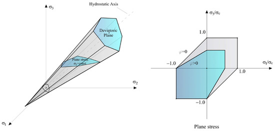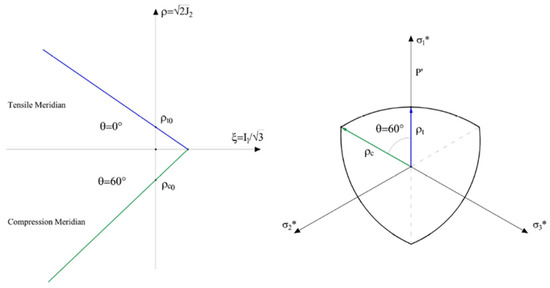 corresponding to the sectors and , respectively. The meridian corresponding to the angle is called “meridian of compression”, being characterized by compressive stress superimposed on the spherical stress state, in one direction, while the meridian corresponding to is called “meridian of traction” being characterized by tensile stress superimposed on the deviatoric stress state, in one direction.