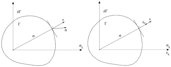 The failure criteria define the elastic limit of a material subjected to a complex stress state [8,9,13]. The fundamental problem is to relate the critical parameters of the material obtained with simple uniaxial tests, with the resistance of the material subjected to multiaxial stress regimes. The result is the definition of a hypersurface , boundary of a domain Γ, in the space of the independent components of the stress tensor . These components, for convenience, can be arranged in the vector . We therefore define a yield function, dependent on the state of point stress . This function can be expressed in a general way as: