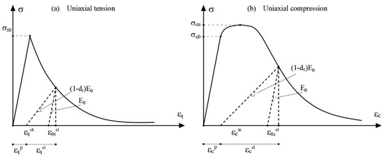 As regards the uniaxial tensile behaviour, also in this case an elastic region and an inelastic region are distinguished based on Guo [18,23]. The σ-ε constitutive law is described by the following relations: