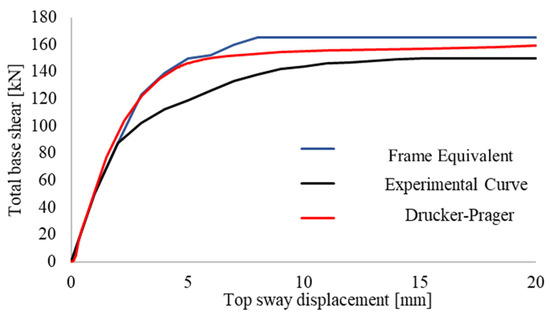 Comparison among frame equivalent, experimental and Drucker-Prager pushover curves.
