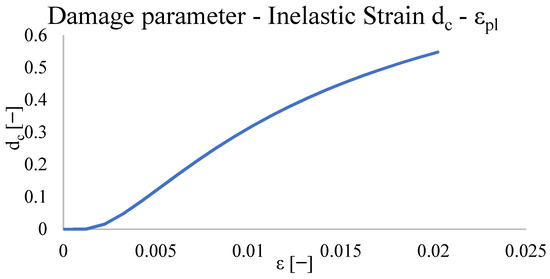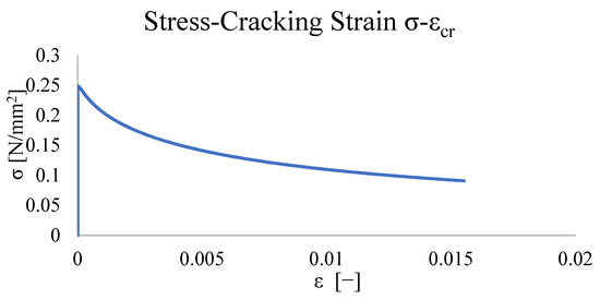 In Figure 24 and Figure 25, the Stress-Cracking Strain (, and Damage Parameter-Cracking Strain ( are reported, obtained by Equations (101), (102) and (107). The parameters adopted for the material characterization are reported in Table 5.