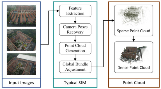 Structure-from-Motion (SfM) is the primary technique employed for image-based reconstruction methods [23]. It recovers the imaging scene and simultaneously estimates the location and orientation of the camera. A typical SfM pipeline consists of five steps: feature extraction, feature matching, camera pose recovery, point cloud generation, and global bundle adjustment. The sparse point cloud and camera poses generated from SfM can support the subsequent Multi-View Stereo (MVS) algorithm [24,25] to produce a dense point cloud (Figure 1).
