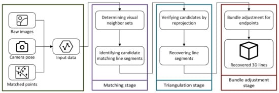 It is difficult to obtain a reliable result with matched line segment inputs using the method mentioned above in many scenarios, such as in the case of poorly textured indoor environments or scenes containing wiry structures [48]. Methods with a complete workflow release the restriction of matching data as input. They usually first select a set of possible matching candidates and then filter out mismatched cases phase by phase throughout the whole workflow. For example, Jain et al. introduced a line-based reconstruction method with a set of images and corresponding cameras [49]. Their method did not match line segments directly, but generated a set of hypothetical 3D line segments and verified them by comparing their projection on different views with observed line segments in images. This strategy avoids the impact of inaccurate line segment matching during 3D reconstruction. Still, the hypothetical 3D line segments were continuously and randomly distributed over an extensive range, causing inefficiency in the verification process. Hofer et al. presented a similar approach with a difference of computing possible matches by the epipolar constraint before generating the hypothetical 3D line segments [50]. As a result, their hypothetical 3D line segments were discretely distributed in several possible locations, improving verification efficiency.