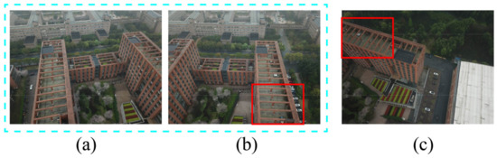 An image-level visual neighbor set contains images with considerable overlap. Searching for line segments only within a visual neighbor set can significantly improve the efficiency. As shown in Figure 5, Figure 5a,b have many matching line segments and can form a visual neighbor set. On the other hand, Figure 5b,c will not be grouped in the same image-level visual neighbor set by traditional methods. However, there is still a small overlap between them, marked by the red rectangle. Herein we introduce a concept of line-level visual neighbor set. This refers to an image set formed by images sharing the same line segment, even if the line segment is in the corner of an image. Employing the line-level visual neighbor set is better able to use the input images and serve the purpose of line-segment matching.