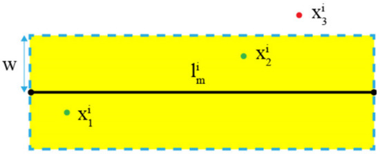 Identifying images sharing the same line segment is the key to building a line-level visual neighbor set. Some scholars have proposed an assumption that adjacent line segments and points on an image have a high chance to co-planarize in 3D space [43,51,52]. Based on this assumption, we use an input-matched point close to a line segment as the reference to find the candidates. In particular, we first build a local region for the target line segment. As shown in Figure 6, a local region is a rectangle centered at the midpoint of the target line segment, whose length is the same as the line segment and the width is . is a user-defined parameter and should be determined according to the shooting distance. The matched feature points within a local region are selected as the reference points for . In Figure 6, and are the reference points while is not. All images possessing a reference point of form a line-level visual neighbor set for . We only need to search for matching line segments in this set in the following steps.