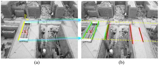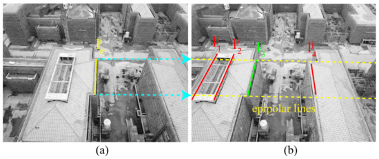 In addition, we set a maximum quantity to maintain a manageable number of candidates and computational load for subsequent steps. If there are no more than line segments identified for an image in this step, all of them will be preserved. Otherwise, we rank the line segments by the distances between them and the matching feature point and only pick the top as the candidates. Taking the images in Figure 9 as an example, is one of the reference points for the target line segment in Figure 9a and is the matching feature point for in Figure 9b. It shows that six line segments in Figure 9b satisfy the epipolar constraint. If is set as , the three green line segments closer to are preserved.