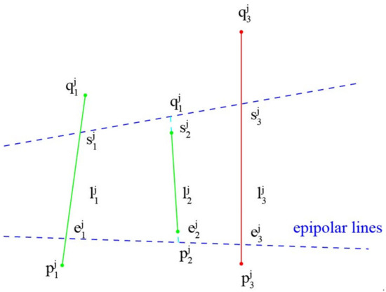 where and are the endpoints of a line segment ; and are the two intersection points between the infinite line corresponding to and two epipolar lines. If is lower than a user-defined threshold , is considered to be a candidate, and otherwise not. As shown in Figure 8, although none of the three line segments strictly meets the epipolar constraint, the errors of and are both within an acceptable range. Therefore, and are persevered as matching candidates and is rejected.