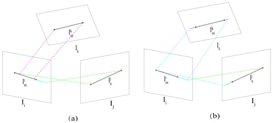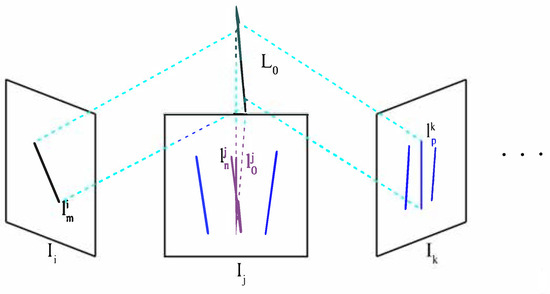 The candidate set may still contain many mismatching cases. This step employs the trifocal tensor to examine all projected candidates to remove mismatched ones iteratively. As shown in Figure 10, and both belong to the visual neighbor set of the target line segment . The blue line segments in and are the matching candidates for in . Regarding , and the selected candidates from are triangulated to from a hypothetical 3D line . Then, is projected onto another visual neighbor image to form a hypothetical 2D line . The collinearity of with other possible matching line segments in image (e.g., ) is calculated to determine if they are the same line segment. The collinearity can be defined as