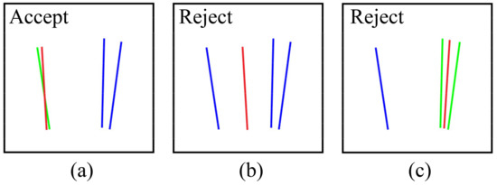 After measuring all the candidates, there are three possible scenarios. Figure 11 illustrates the cases with the red line segment being the hypothetical line segment, the green line segments being the accepted ones, and the blue line segments being the rejected ones. In the first scenario in Figure 11a, there is only one line segment satisfying the condition. We accept it as the true matching line segment for the hypothetical 3D line. If no line segment satisfies the condition, as shown in Figure 11b, we reject them all. If more than one line segment satisfies the collinearity, as shown in Figure 11c, there is a high possibility that these line segments are very close to each other in the image. Considering inevitable camera pose errors, selecting anyone of them as the true matching line segment would be risky. To avoid interference introduced by this situation, all candidates are rejected. This strategy may affect the recall rate but significantly improve the matching precision. Section 4 discusses this situation with more details.