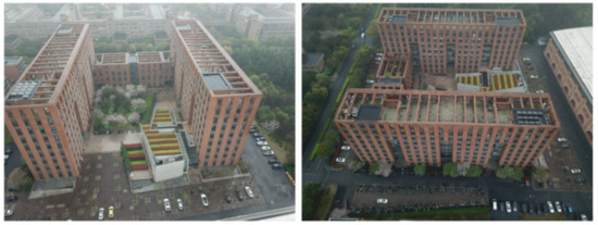 The final reconstruction results of the building are shown in Figure 23. The building in the middle is our main reconstruction target. The profile of the building was successfully reconstructed. Some building details, such as the windows and the texture lines of the roof, were also preserved. In comparison, the building roof was better reconstructed than the building façade. As shown in Figure 23, the building roof was presented in significant detail, while the building façade was missing some edges. The main reason for this phenomenon might be the shooting angle of the UAV. While taking pictures, the UAV was often above the building, and captured more details of the building roof than of the building façade. Increasing the number of building façade images would effectively solve this problem.