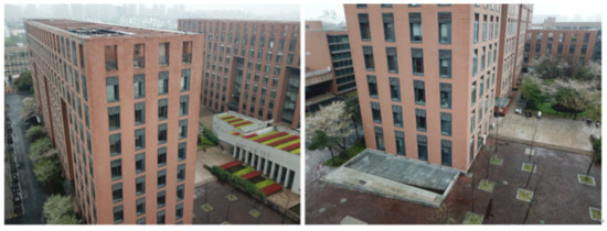 We tested our method on challenging real-world images. The target was an office building with significant linearity. A total of 124 drone images of the whole building were taken from different perspectives at a distance of around 100 m (Figure 13). Additionally, 168 drone images of one of the building’s walls were taken from different perspectives from a distance of around 50 m (Figure 14). Testing images with different shooting distances were used to comprehensively evaluate the reconstruction effect.