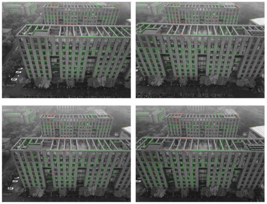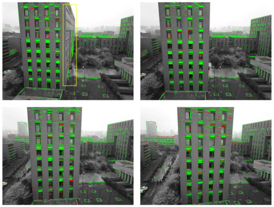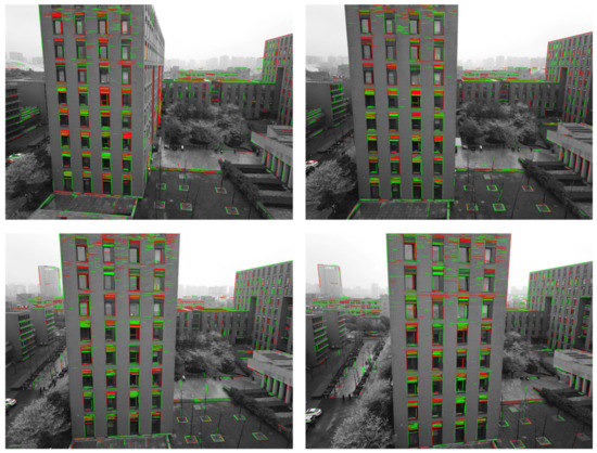To demonstrate the improvement of matching accuracy after each stage, we randomly selected a set of images from each of the two image sets for examination. The matching results are illustrated in Figure 15, Figure 16, Figure 17 and Figure 18. The correctly matched line segments are labeled in green, and the mismatched ones are labeled in red.