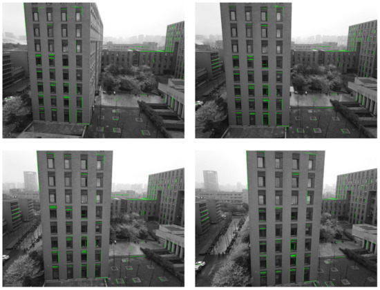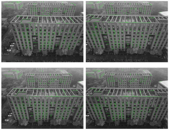 In comparison, the matching precision of the wall image set was slightly lower, mainly due to the noise introduced by the line distribution pattern of the images. There are too many line segments close to each other that form clusters in the wall images, for example, the window, the blinds, and the surface texture of the wall. The building images, on the other hand, have most of the line segments sparsely distributed, leading to better effectiveness and precision of selecting matched line segments.
