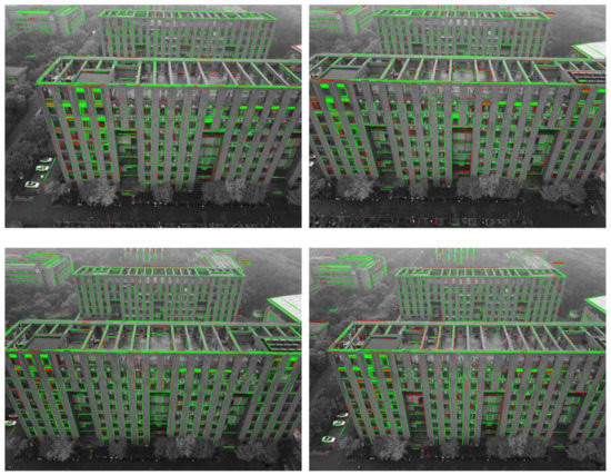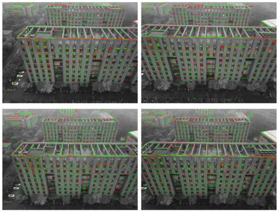 where (false negative) is the number of falsely rejected line segments. Recall reflects the effectiveness of the algorithm and the richness of the edges in the final reconstructed scene. The results of recall are shown in Figure 19, Figure 20, Figure 21 and Figure 22. Successfully matched line segments are labeled in green, while line segments reserved in the previous stage but failed matching in the current stage are labeled in red.