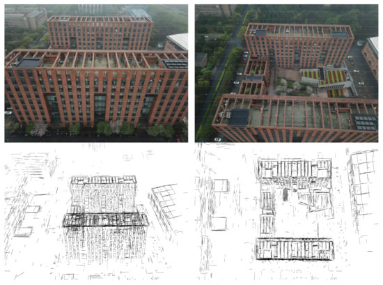 A point cloud can flexibly depict an object with an irregular shape. However, unlike natural landscapes, a building’s outline is primarily composed of straight-line segments. 3D reconstruction using a typical point-based SfM method often fails to represent the building shape accurately and leads to edge distortions [26,27], as shown in Figure 2. Some scholars have attempted to extract edge points from the point cloud and restore building edges using the detected edge points [20,28,29]. Adopting such an approach can ensure the linearity of the building edge, but the possible absence of the edge points themselves can lead to a reduction in the accuracy of the building edges fitted by them.