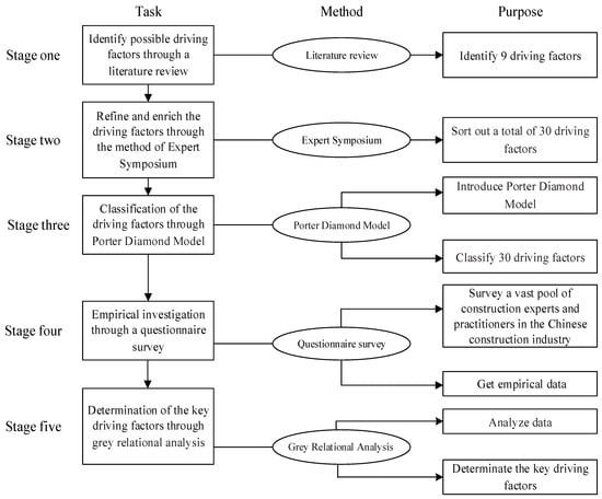 Figure 1. First, we identified and determined the driving factors through a literature review and an expert symposium in stages one and two; secondly, we introduced Porter Diamond Model (PDM) to classify the driving factors based on its advantages in stage three; thirdly, we carried out the investigation in stage four; and finally, we determined the relationships between the factors and IC development based on grey relation analysis (GRA) according to their use in solving problems in stage five.