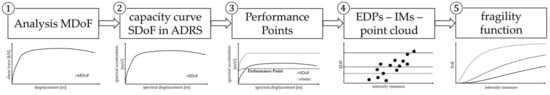 Detailed guidelines for the different possibilities of developing analytical seismic vulnerability functions are given in []. The most important steps in the process of deriving fragility functions, in general, are summarised as follows (Figure 2):