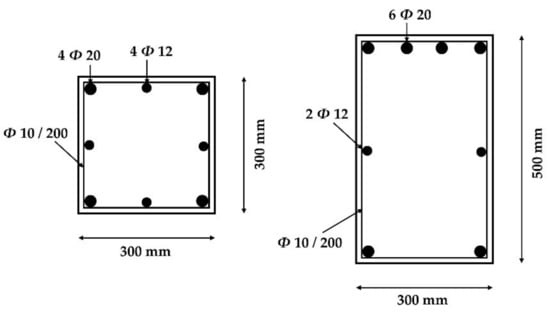 For the columns in all storeys, a section of 300 mm × 300 mm, with a longitudinal reinforcement of 4 Φ 20 mm in the corners and 4 Φ 12 mm at the sides, is defined. The transverse reinforcement consists of 10 mm bars with a spacing of 200 mm and two stirrup legs each along width and height. The beam section is 300 mm wide and 500 mm high with a longitudinal reinforcement of 4 Φ 20 mm at the top, 2 Φ 20 mm at the bottom and 2 Φ 12 mm at the sides. The transverse reinforcement for the beam is the same as for the column. The positions of the lap joints are in the respective pressure zones. The sections are shown in Figure 4.
