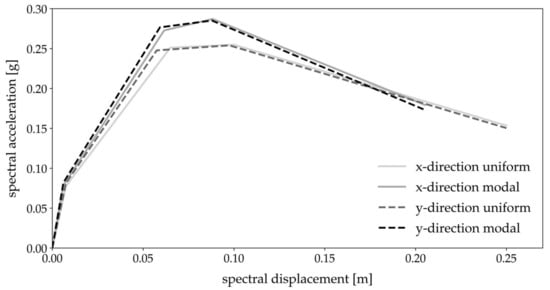 The decisive criterion occurs with the smallest step—having regard to the special features of some global criteria—and, thus, with the lowest displacement for the related damage grade. The positions of the damage grades of all analyses were determined on the basis of the defined criteria using a set of Python scripts. Figure 5 shows the pushover curves with the derived damage grades for four representative analyses—x-direction with uniform horizontal load pattern, x-direction with modal horizontal load pattern, y-direction with uniform horizontal load pattern, and y-direction with modal horizontal load pattern. The different directions have little influence, whereas the influence of the load patterns is significant. Therefore, EC8 [] postulates investigating different lateral load distributions to consider the most unfavourable effects.