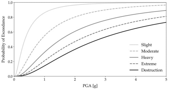 The output of VMTK is discrete values for PGA and probability of exceedance for each defined damage grade. These values are the basis by which to determine curve parameters, mean and standard deviation for the continuous cumulative lognormal distribution, using the method of least square minimizing the sum of squares of the residuals (data points–function values). In Figure 8, the resulting fragility functions for the derived damage grades are exemplarily presented for the chosen RC building model.
