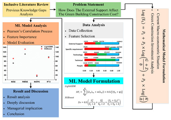 The present study consists of the following phases. The primary goal is to create a model for estimating green construction project costs based on external support impact. First, the current situation is examined using updated parameters of the traditional macro-econometric model to approximate fluctuations in domestic output because of green construction investment. The economic situation’s issues within the existing macro-econometric model are then included in the study to increase the model’s proficiency. Next, the implications of public finance on public investment (particularly the calculation of governmental bond equilibrium as a percentage of GDP) in the green building industry are investigated. Following that, data collection and feature selection were carried out. Finally, a machine learning algorithm discusses and simulates the applicability of the proposed model. Figure 1 represents a flowchart of the adopted research methodology.