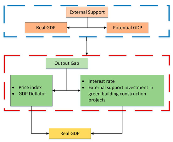 As a result, the output gap is used as an explanatory feature to arrange the link between the price index, the output gap, and interest rates to include it in the model’s form. The model’s basic setup takes price declination effects into account. During a deflationary phase, when demand falls below supply, the GDP deflator and the consumer price index decline in proportion to the production gap level. Furthermore, if the economic stimulus is measured in financial expenditure, GDP on the demand side will rise, the output gap will narrow, and the GDP deflator and price index will enhance. Consequently, real GDP variations are estimated while considering price impacts. The fundamental setup of the developed mathematical model that investigates the impact of interest rates is also demonstrated. Because of a scarcity of cash in the market because of financial expenditure, it is believed that interest rates will rise, and green building investment will fall.