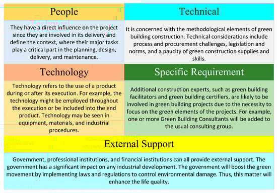 Switzerland’s “Building program” incentivizes house restoration to enhance windows, walls, roofs, and floors [35]. Another representative example from Singapore that illustrates the role of external support in fostering the transformation into green construction, where the government established the Green Mark Scheme (GMS) 17 years ago to endorse green and sustainability in the erected setting and enhance ecological consciousness amongst designers, developers, and builders throughout the project life cycle, from scheme conception and design through completion. They have developed a series of incentives to promote the private sector to assemble green buildings that earn the highest GMS rating, reimbursing up to 50% of qualifying expenses to increase buildings’ energy efficiency [36]. A project is also ongoing to develop strategies for the National Sustainable Development Plan (), providing economic advantages and inducements to encourage green and sustainable construction in Colombia [37]. Lacking a special enticement for the construction process itself, the improved investment adjustment plan in the United Kingdom enables a 100% investment cost deduction in meeting the criteria for having equipment that can be used to save energy [38]. In the same vein, in Portugal, metropolitan buildings’ estate transfer taxes can be waived if the energy effectiveness of the building is improved. Additionally, metropolises might additionally lower community estate tax rates for inner-city houses deemed energy-effective, sustainable, and green depending on annual power usage [39].