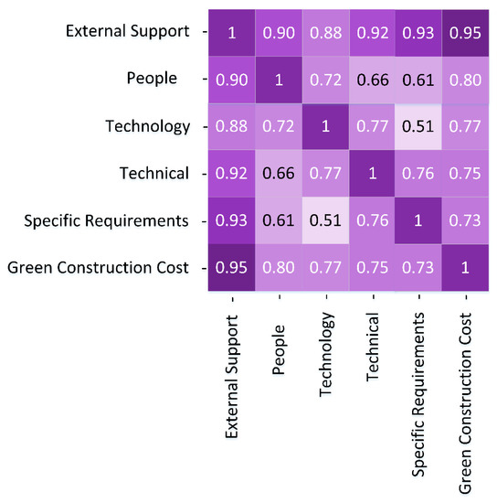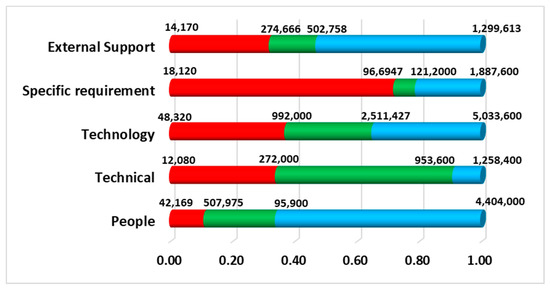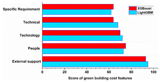 Figure 8 depicts the Pearson’s correlation process between chosen characteristics and the expense value of the green construction project to examine the effect of external support attributes on other features and the green building cost. Improved comprehension of the model’s properties aid decision-makers in efficiently planning and formulating policies. Consequently, a feature significance method was performed utilizing the and to determine the relevance of each feature included in projecting the green building cost. A feature scale, furthermore, a plot to produce a relative score for each variable was utilized. Additionally, as shown in Figure 9, the characteristics were prioritized in the following order: External support, People, Technology, Technical, and Specific demand. The analysis results imply that external support is critical in reducing the green construction project cost via an interconnected effect on all influential factors. The external support factor positively influenced the green construction cost, specific requirements, technical, people, and technological aspects in a descending manner with and respectively.