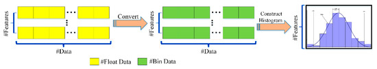 The algorithm is produced based on the decision-tree concept by Microsoft Research [51,52]. Additionally, it needs low memory space to be run with high accuracy; thus, it is considered an effective technique for solving regression and classification problems. The technique was formulated based on three algorithms [53]; (1) gradient-based one-side sampling () which is used to preserve all large gradients and implement random sampling on small gradients; (2) exclusive feature bundling () which is used to break features into fewer mutually incompatible packages; and (3) once the features are converted, the required quantity of statistics will be accumulated in the histogram to find the optimal division spot based on the detached value in the histogram as presented in Figure 5. Figure 5 also provides the histogram approach and tree leaf-wise growth technique used in the algorithm to develop the training procedure and reduce memory utilization. Level-wise and leaf-wise development methods were also illustrated in Figure 6 to explain that the leaves on the same layer are separated simultaneously. Optimizing several threads is preferable to maintain model complexity under control. Moreover, even though different amounts of information are absorbed, leaves on the same layer are processed uniformly.