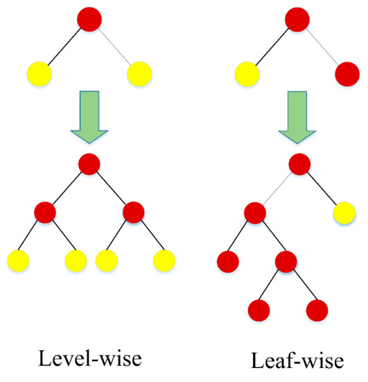 Because the leaf-wise strategy only splits the leaf with the essential information gained on a similar layer, it has a better probability of succeeding, as seen in Figure 6. Additionally, trees with a high level of depth can be produced utilizing this method; accordingly, a maximum depth limitation is established through tree growth [54].
