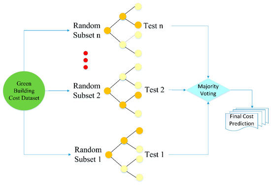 where denotes the predicted green building cost by the , n denotes the decision tree’s number, denotes tree’s prediction of green building cost, denotes the input feature, and denotes the tree’s learned feature.